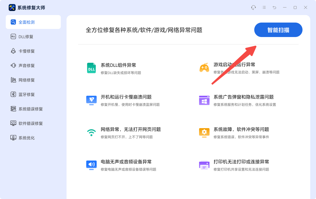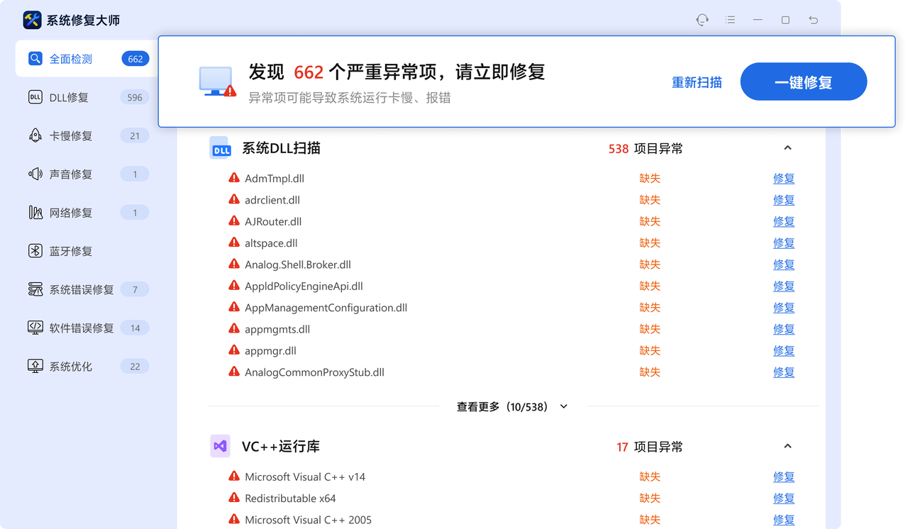 通过智能扫描,检测所有缺失DLL文件,快速修复软件或游戏无法启动,提示缺少DLL的报错问题。